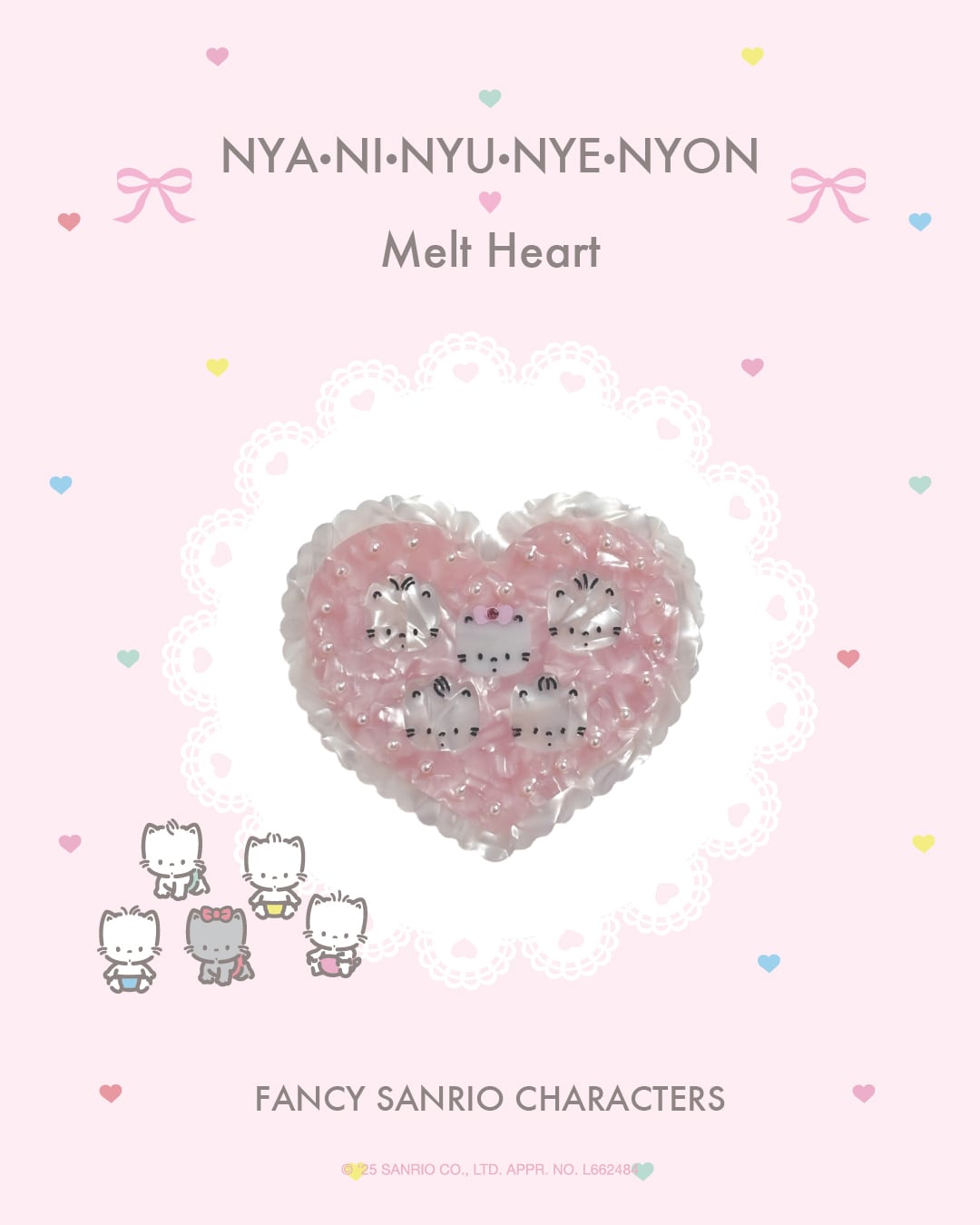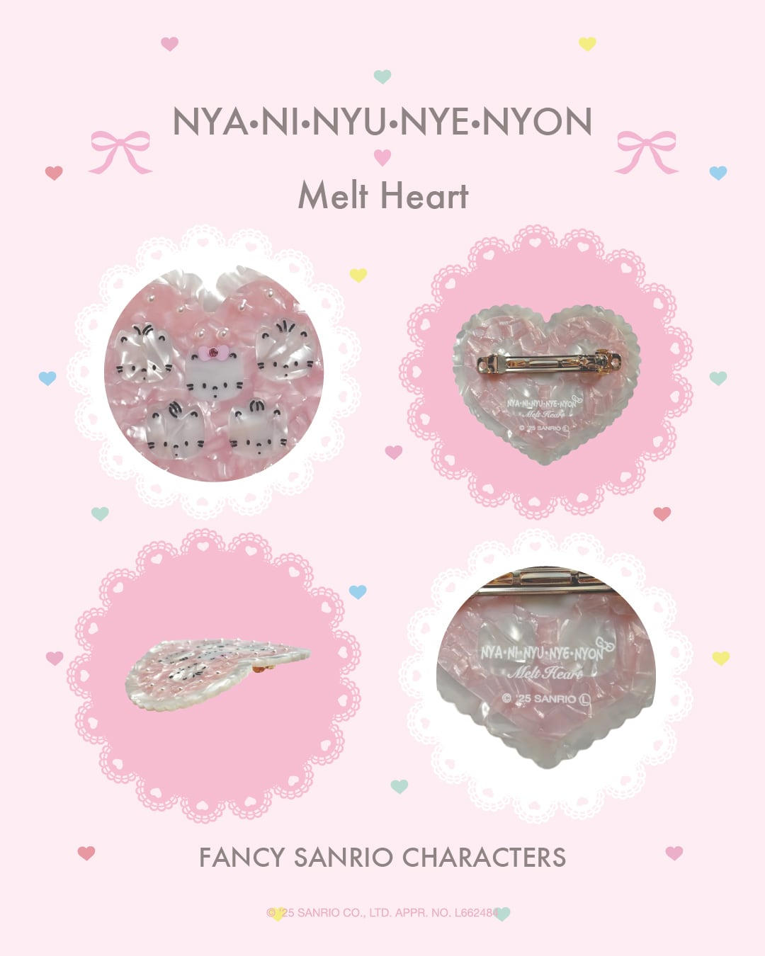 ハートにちょこんと並んだニャニィニュニェニョンがかわいいバレッタです。