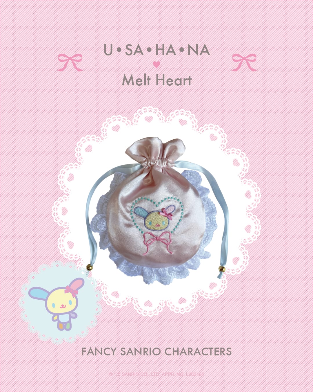 光沢が美しいサテンにウサハナの愛らしい刺繍が施された巾着。