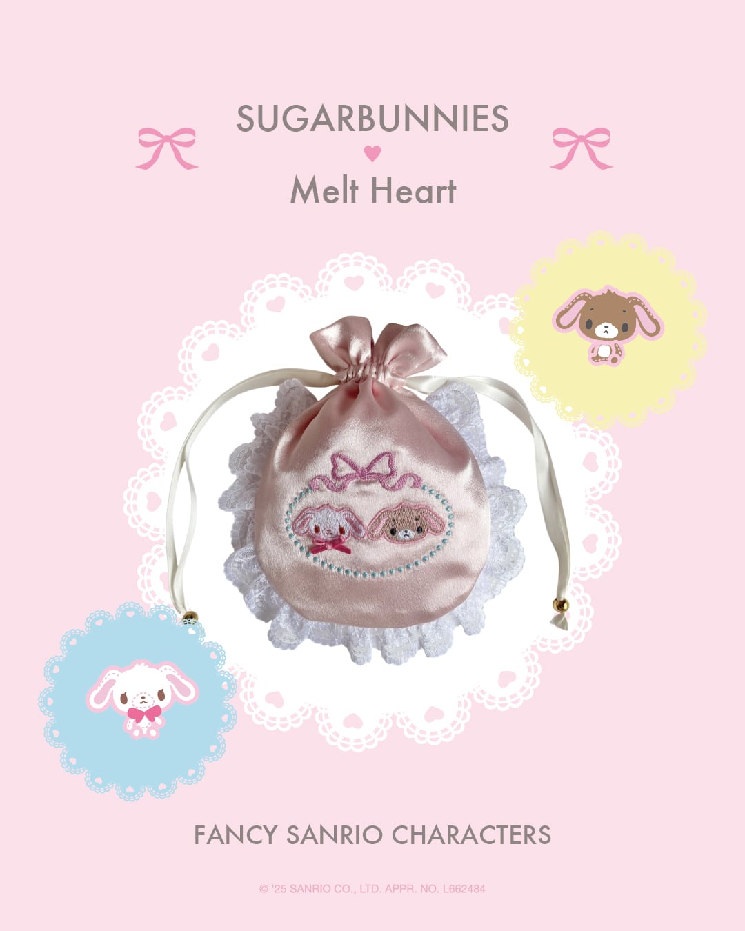 光沢が美しいサテンにシュガーバニーズの愛らしい刺繍が施された巾着。